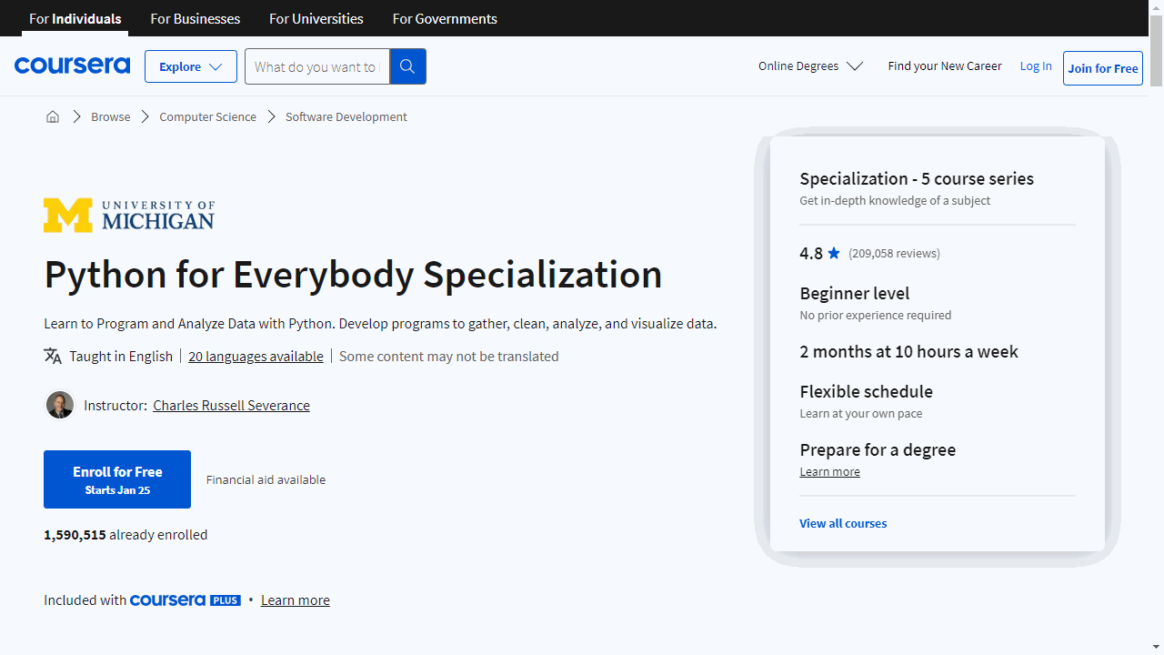 تخصص مكون من 5 دورات تدريبية لشرح أساسيات البرمجة بلغة بايثون، يقدمها الدكتور تشارلز سيڤرنس من جامعة ميشغن على منصة كورسيرا، يصاحبه كتاب متاح مجانًا، وله ترجمة عربية. سبق وأن تعلمت أساسيات البرمجة بلغة بايثون وجافا منذ عدة سنوات، ولكن لم تضطرني الظروف إلى استخدامها عمليًا إلا فيما ندر. الآن عزمت على إعادة إنعاش مهاراتي البرمجية وتطويرها بما أني مقبل على إكمال دراساتي العليا في الإنسانيات الرقمية (Digital Humanities).